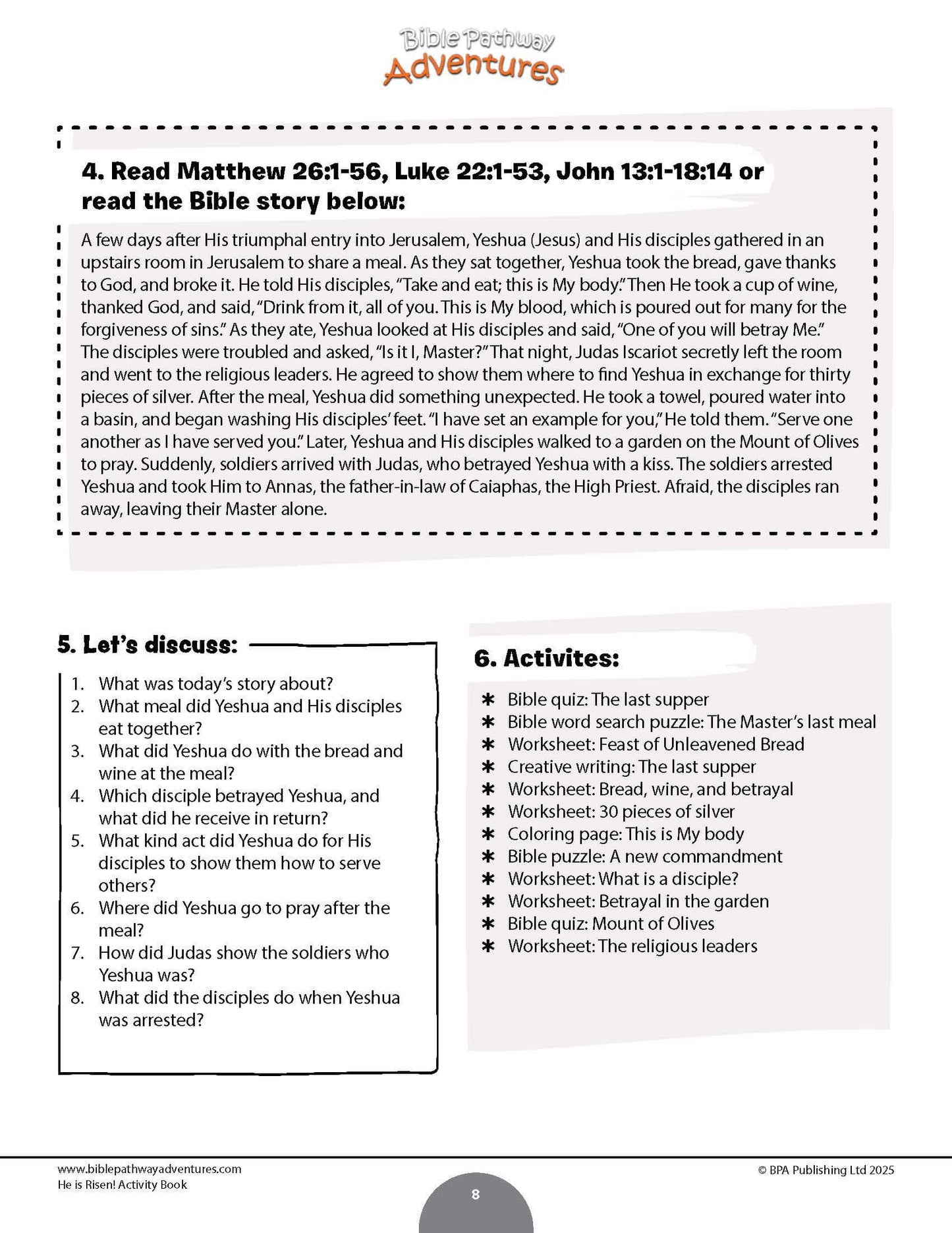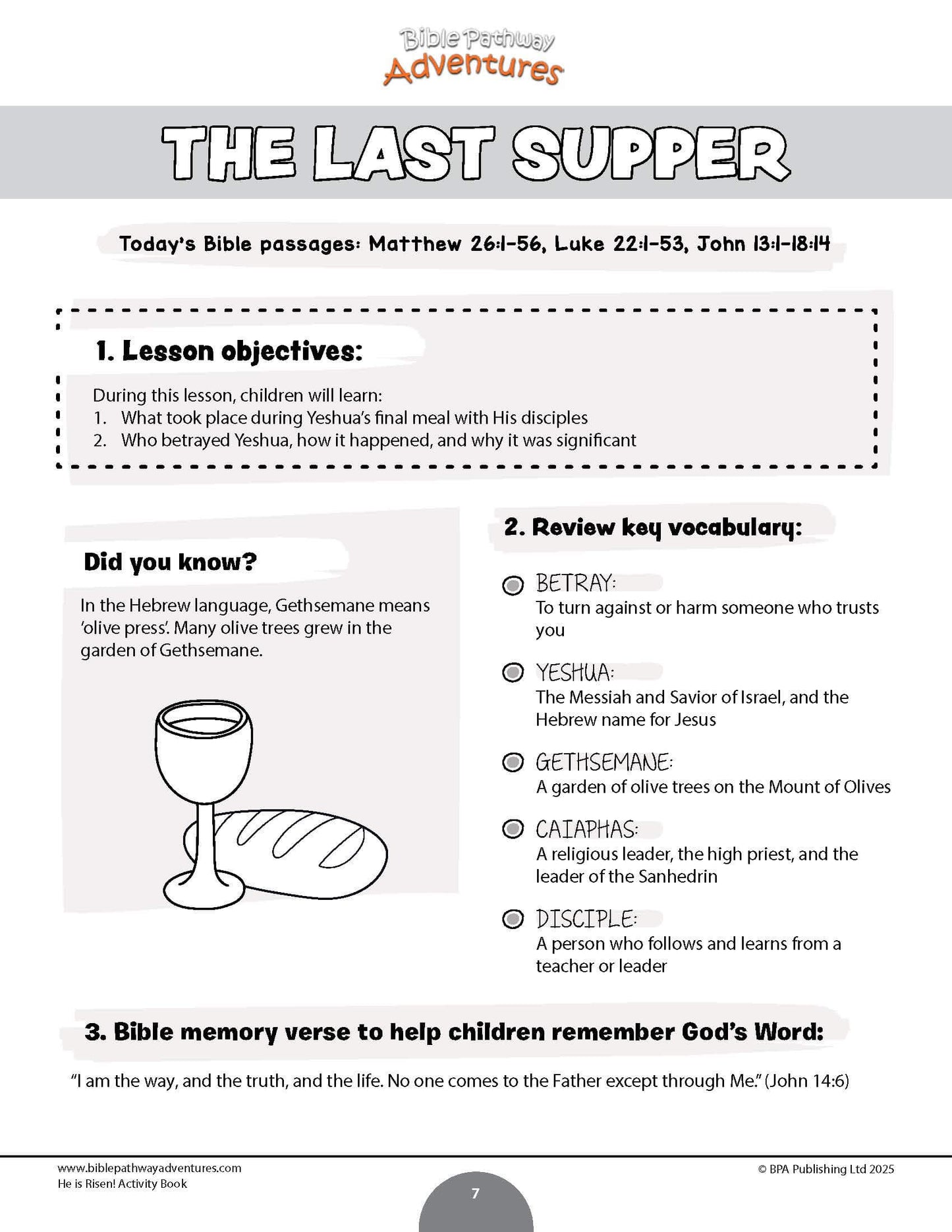 With no-prep lessons covering everything from Yeshua’s arrival in Jerusalem before the Feast of Unleavened Bread to His departure on the Mount of Olives, you’ll save time while inspiring children with engaging, age-appropriate content.