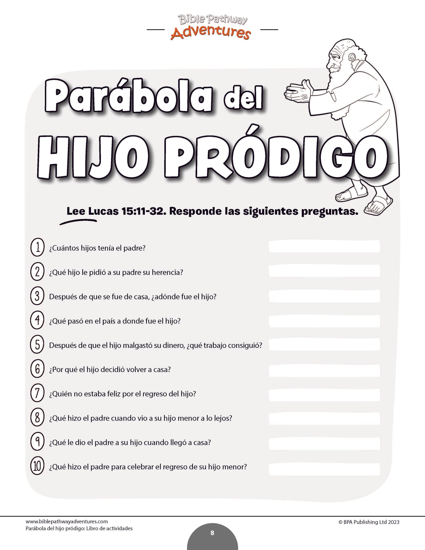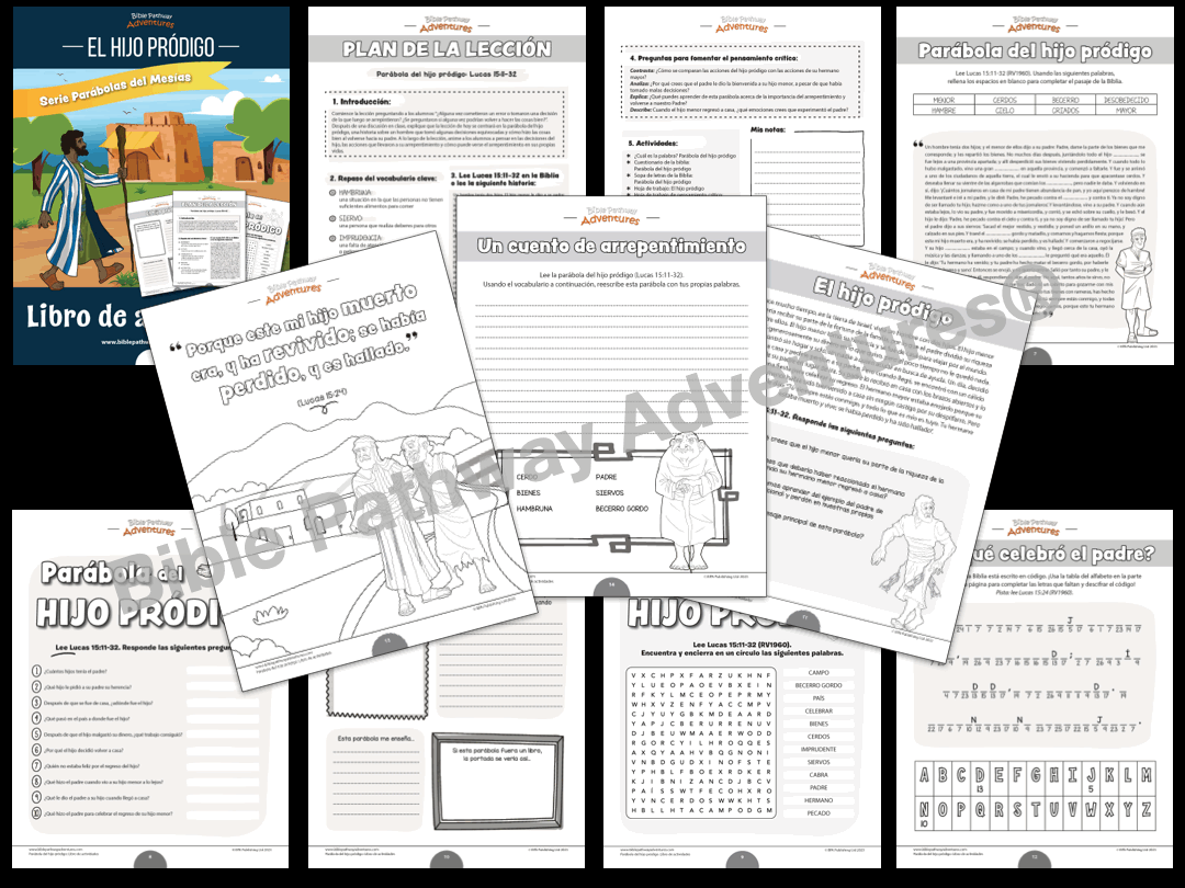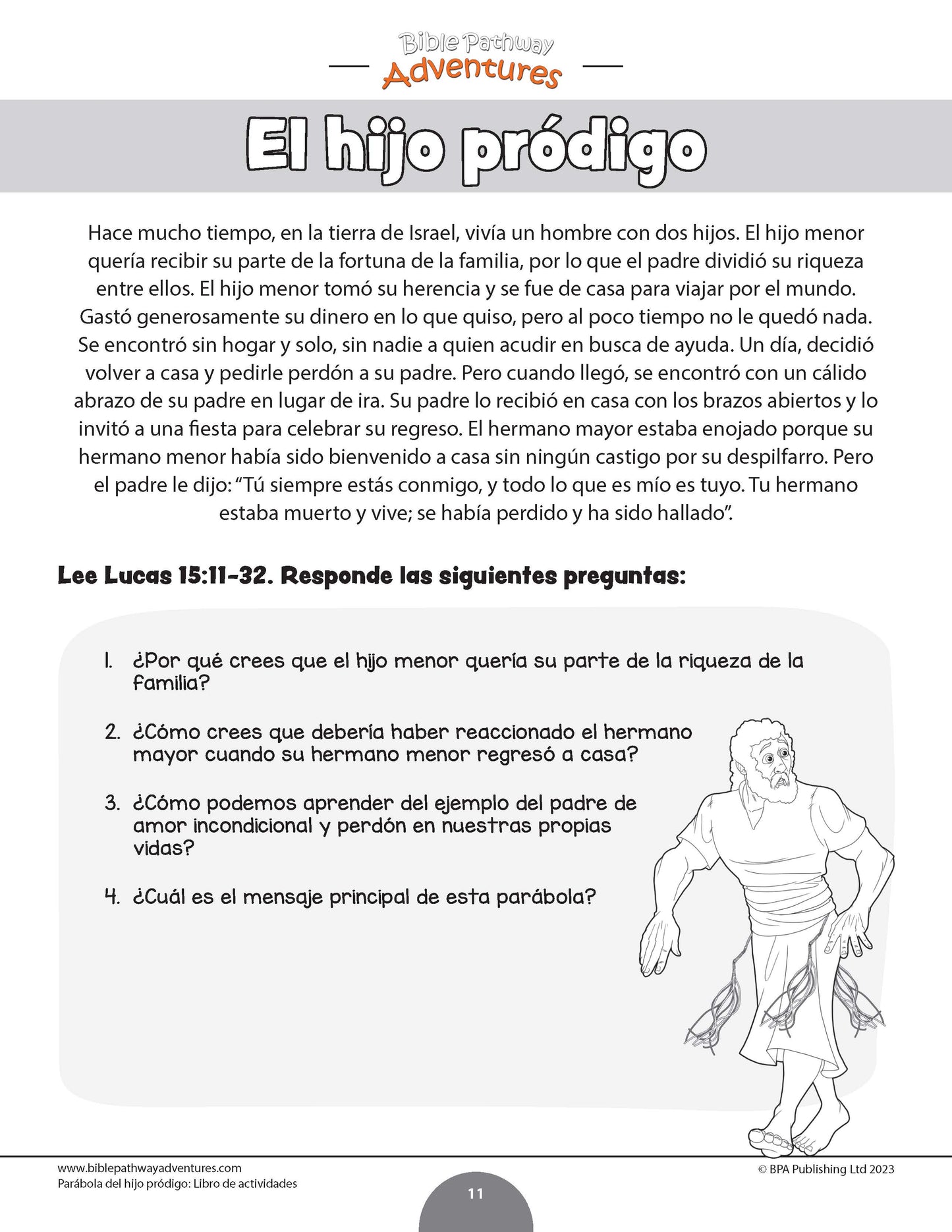 • Plan de lección fácil de usar sobre la Parábola del hijo pródigo que incluye una introducción a la lección, una historia bíblica cuidadosamente redactada para niños, repaso de vocabulario clave, preguntas de comprensión sobre la historia bíblica y 8 actividades divertidas para ayudar a los niños a recordar lo que han aprendido