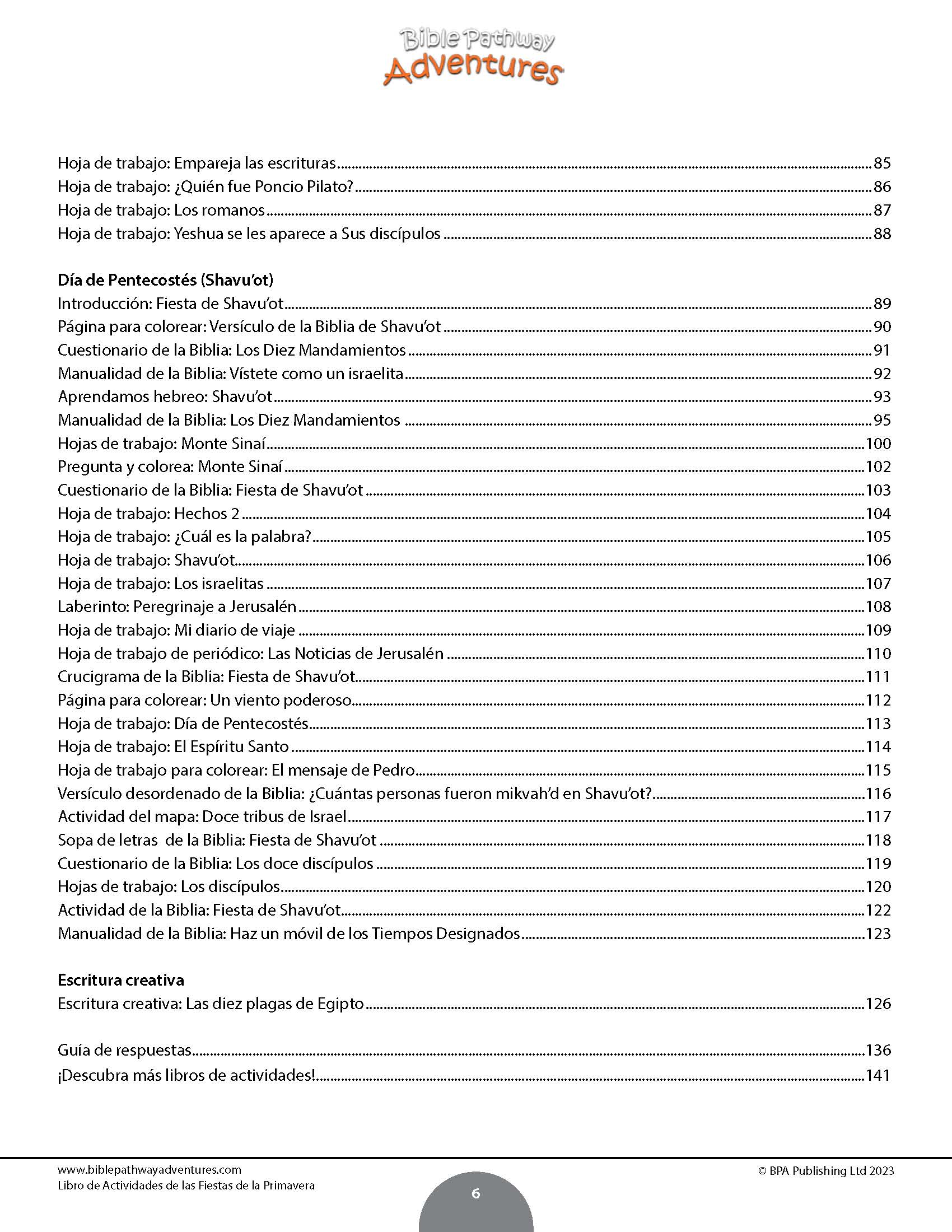 - Libro de actividades de las fiestas de la primavera (8-12): Enseñe a sus hijos a seguir los pasos de Yeshua y celebre las fiestas con el Libro de actividades para niños: Fiestas de la primavera. Repleto de prácticas hojas de trabajo, páginas para colorear, manualidades y rompecabezas, aprenderán la historia y el cumplimiento de las Fiestas de Primavera de una manera divertida y atractiva. Desde la Pascua hasta las Primicias y Shavu’ot (Pentecostés), este libro de actividades revela cómo el Mesías honró y cumplió las Fiestas de Primavera de Israel. Los niños descubrirán cómo Moisés y las diez plagas estaban conectadas con la primera Pascua de los israelitas en Egipto, cómo la crucifixión y resurrección de Yeshua cumplieron la profecía bíblica, cómo hacer matzah, la ubicación del Gólgota, por qué los sacerdotes sobornaron a los guardias romanos, cómo los discípulos honraron el Shavu'ot, lo que Yah les dio a las 12 tribus de Israel en el monte Sinaí y mucho más. ¡Obtenga su copia hoy y brinde a sus hijos una experiencia educativa memorable!