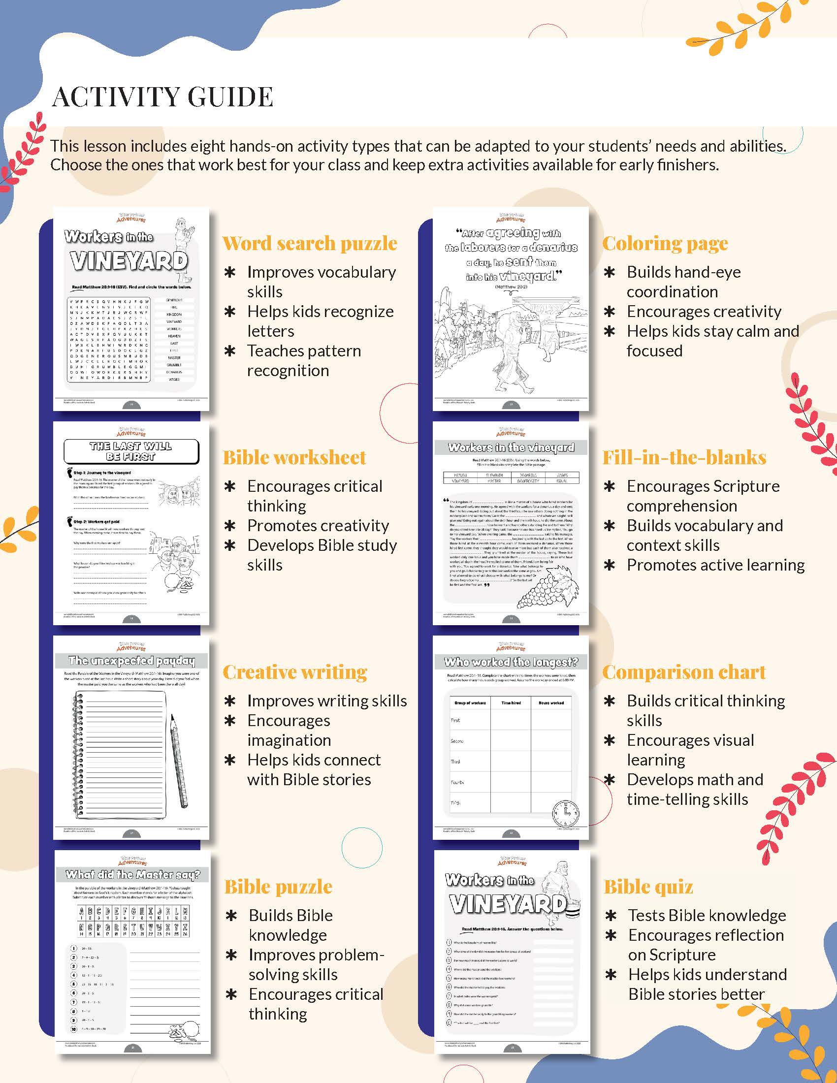 - A done-for-you Workers in the Vineyard lesson that includes a lesson introduction, carefully written kid-friendly Bible story, key vocabulary review, Bible story comprehension questions, and 8 interactive activities to reinforce learning