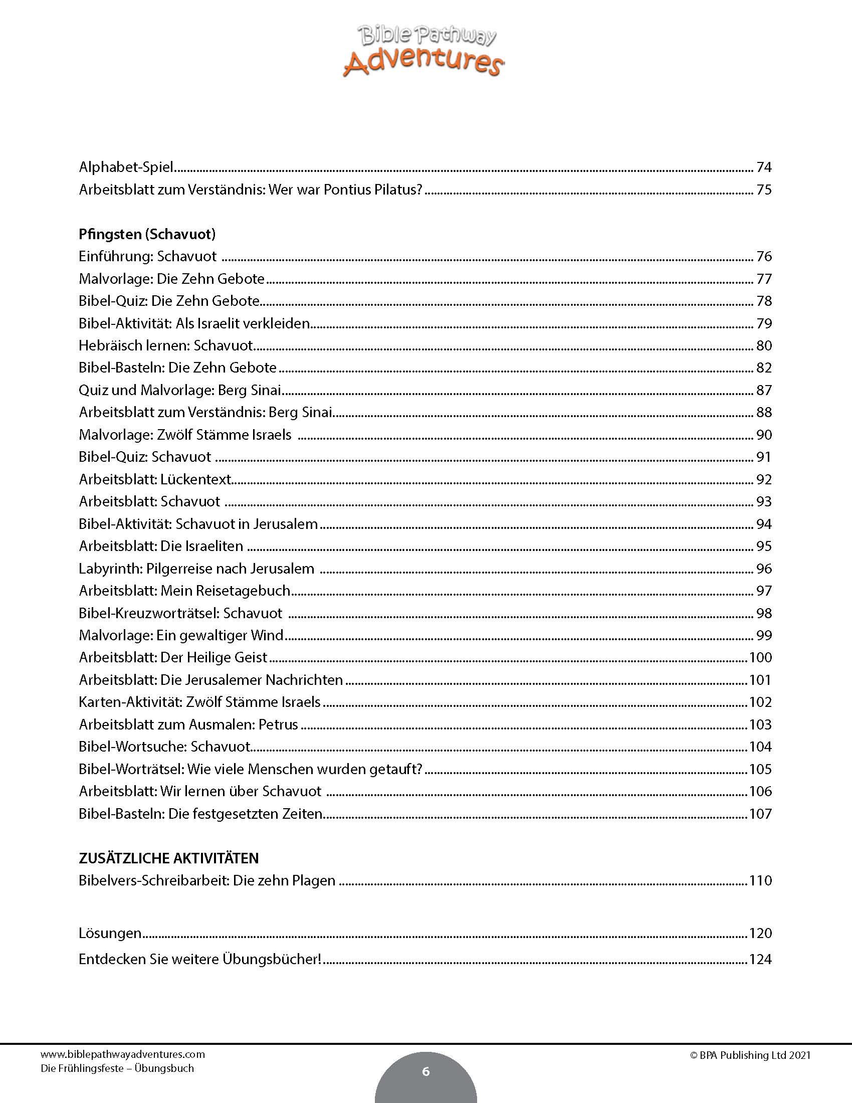 • Über 120 Seiten mit lustigen und spannenden Aktivitäten im PDF-format (8,5" x 11"). Themen sind Pessach und das Fest der ungesäuerten Brote, das Fest der Erstlingsfrucht und Schavuot (Pfingsttag)