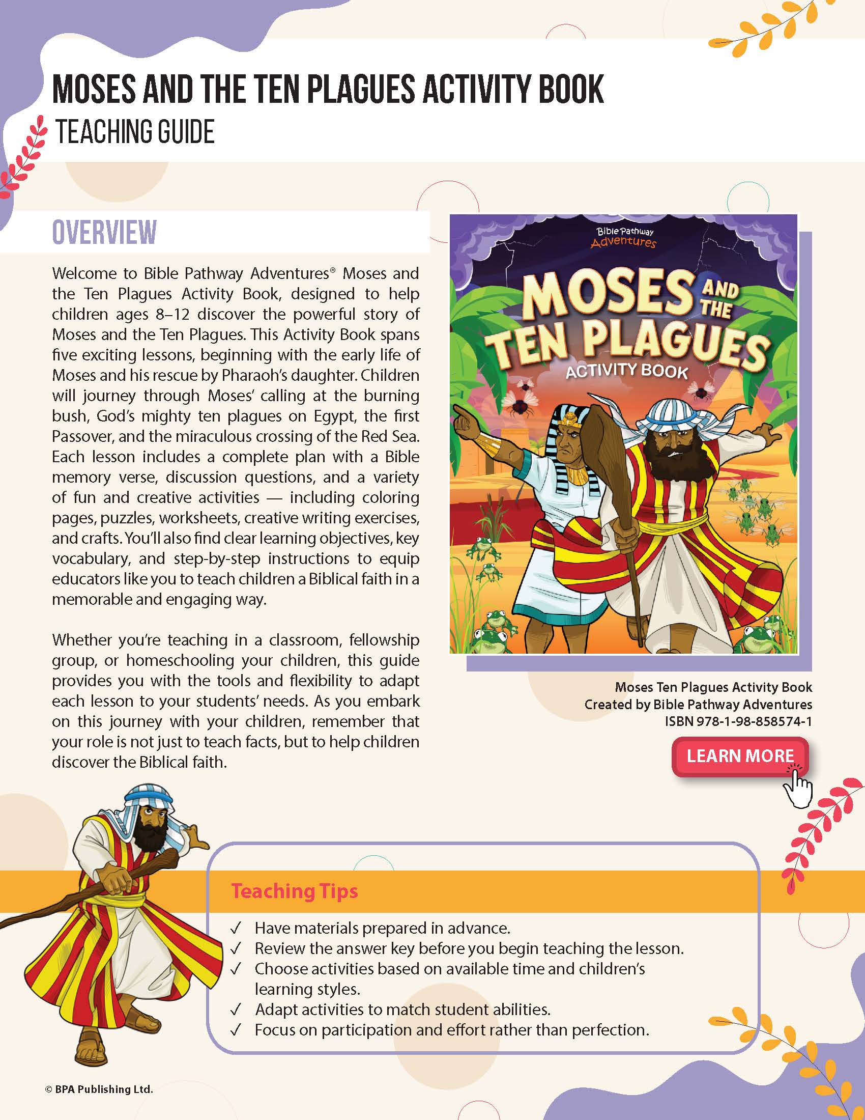 Children ages 8-12 will love learning about the 10 plagues of Egypt with our Moses and the Ten Plagues Activity Book. Inside they'll discover how Pharaoh’s daughter cared for baby Moses, archaeological discoveries that show Hebrew slaves lived in Egypt, God's instructions from the burning bush, why God sent ten plagues on the land of Egypt, how the Hebrews honored the Passover in Egypt, how Moses led the Hebrews out of Egypt during the Feast of Unleavened Bread, and the Red Sea crossing. Includes five planned-for-you lessons and a handy answer key for guidance and clarity.