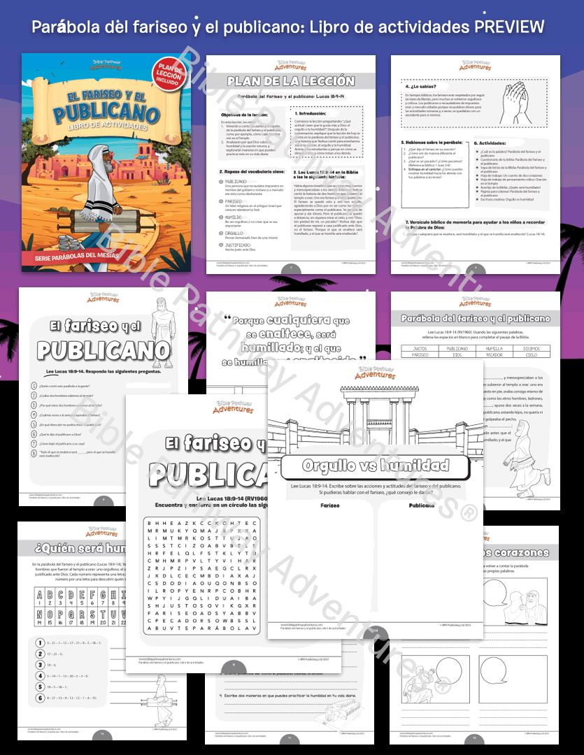 - Plan de lección fácil de usar sobre la Parábola del fariseo y el publicano que incluye una introducción a la lección, una historia bíblica cuidadosamente redactada para niños, repaso de vocabulario clave, preguntas de comprensión sobre la historia bíblica y 8 actividades divertidas para ayudar a los niños a recordar lo que han aprendido