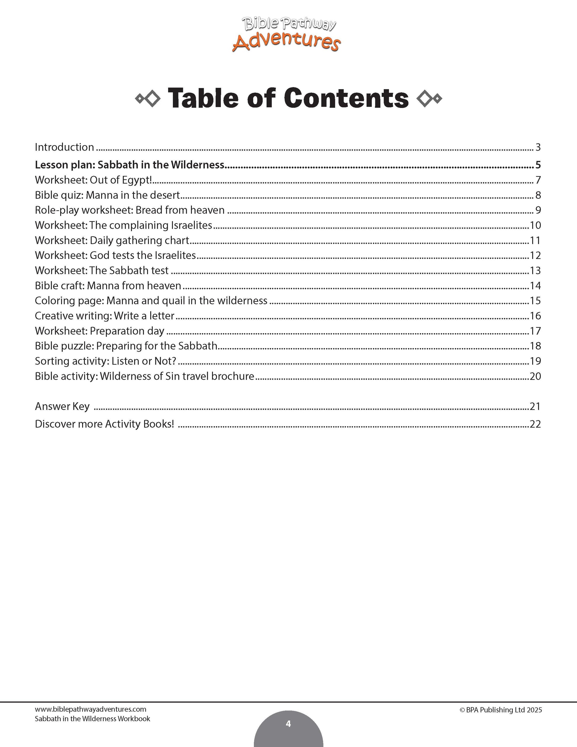Welcome to Sabbath in the Wilderness Bible Workbook, a ready-to-use Bible study resource for Grades 3-6 that helps you teach your children how God first taught the Israelites to honor the Sabbath through the story of manna and quail in the wilderness (Exodus 16).