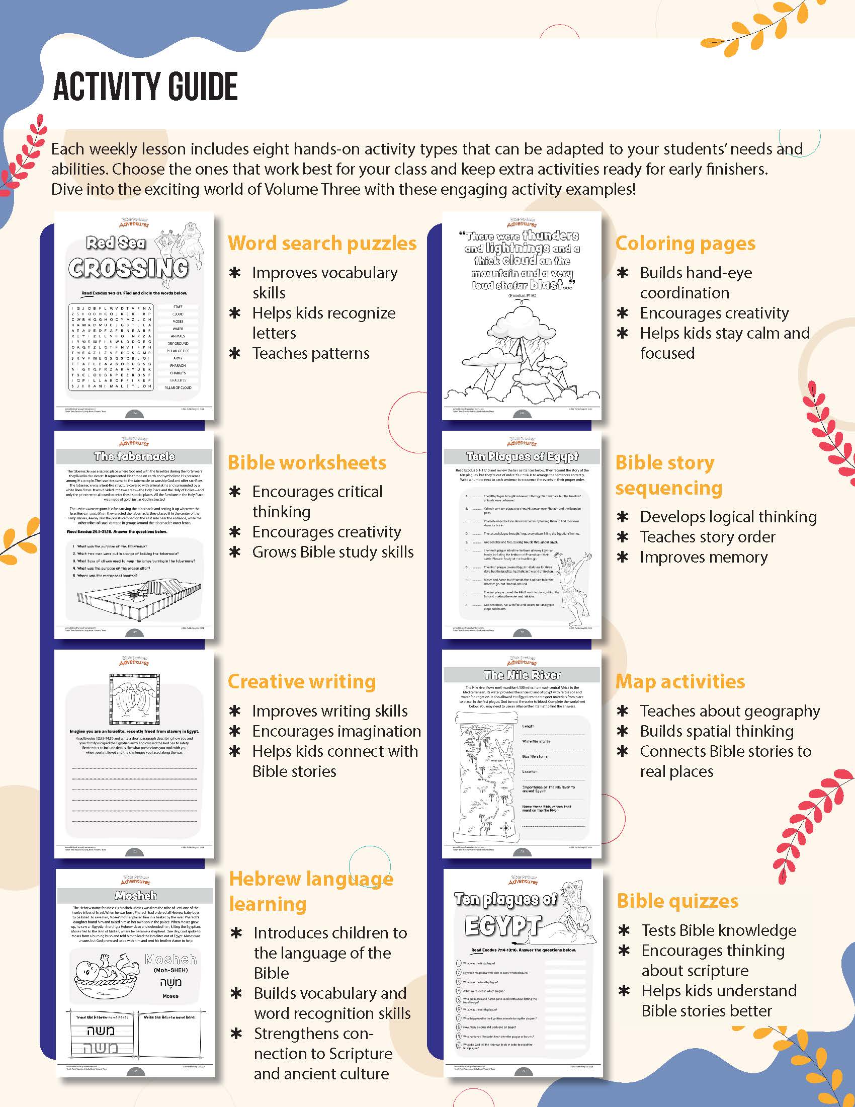 - 13 ready-to-use lesson plans that include lesson introductions, key vocabulary reviews, Bible memory verses, kid-friendly Bible stories, discussion questions, fun Bible facts, and engaging activities to reinforce student learning and increase Bible knowledge
